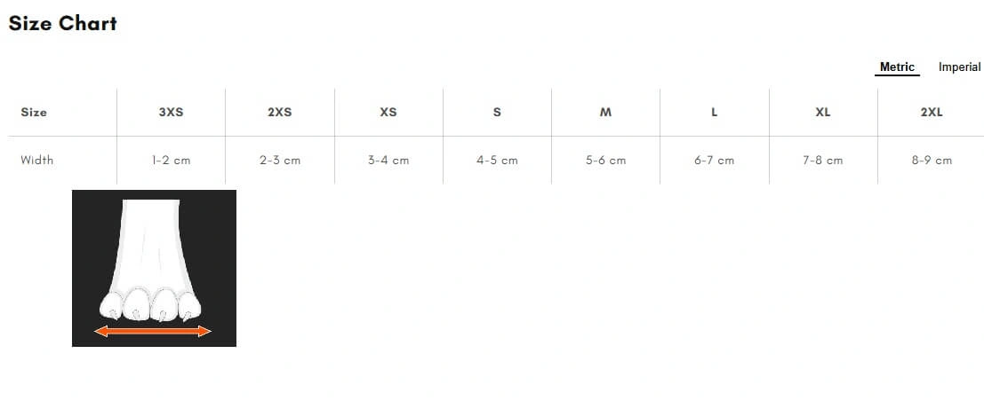 Zmierz łapę psa w najszerszym miejscu, gdy łapa jest swobodnie oparta o podłogę. Do uzyskanego wyniku dodaj około 1–1,5 cm i na tej podstawie wybierz odpowiedni rozmiar z tabeli - szczegóły na zdjęciu