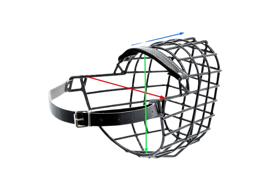 Wysokość (zielona strzałka na zdjęciu)- ten wymiar zdecydowanie jest charakterystyczny dla danego typu kagańca. Jest dobrany tak aby pies mógł swobodnie otworzyć pysk, szczekać czy też swobodnie pić wodę w kagańcu. Wysokość ta jest ustalona dla poszczególnych ras.