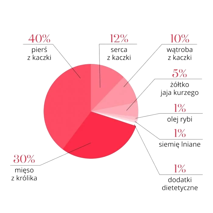 - 70% mięsa z kaczki i królika – wysoce przyswajalne białko o niskiej zawartości tłuszczu, zapewniające energię i siłę do codziennych aktywności