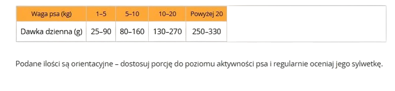 - Wielkość porcji dobieraj na podstawie masy ciała i poziomu aktywności psa, aby wspierać jego witalność, siłę i utrzymanie idealnej wagi