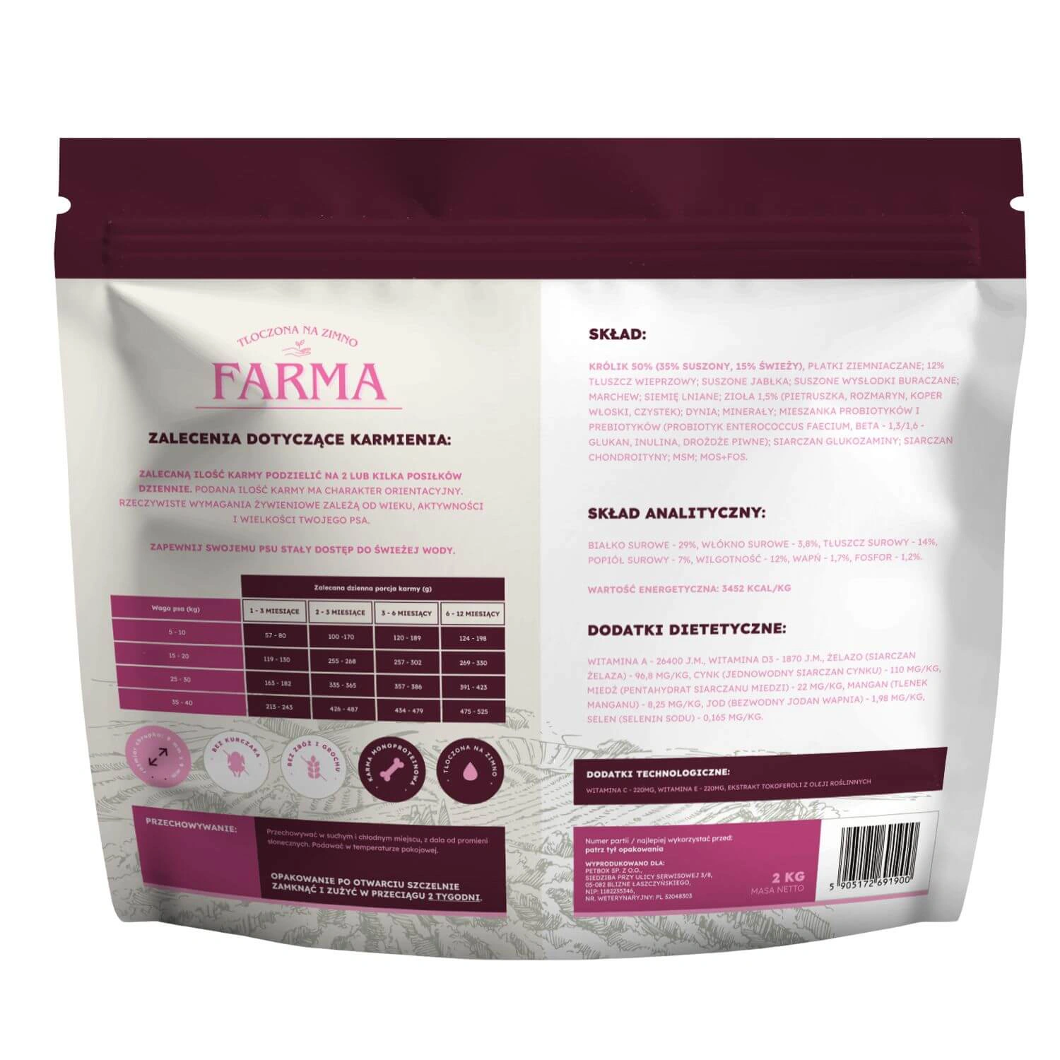Skład: królik 50% (35% suszony, 15% świeży), płatki ziemniaczane, tłuszcz wieprzowy 12%, suszone jabłka, suszone wysłodki buraczane, marchew, siemię lniane, zioła 1,5% (pietruszka, rozmaryn, koper włoski, czystek, dynia), minerały, mieszanka probiotyków i prebiotyków (Enterococcus faecium, beta-1,3/1,6-glukan, inulina, drożdże piwne), kompleks stawowy oraz MOS-FOS.