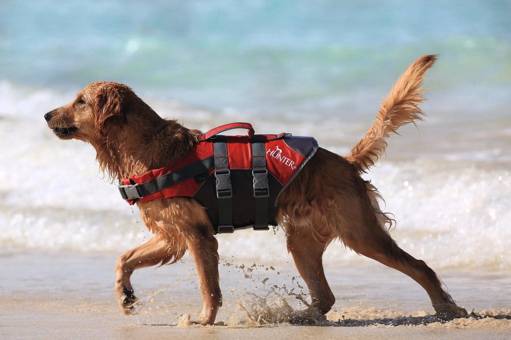 Czerwony kolor z odblaskowymi elementami zapewnia dobrą widoczność psa na wodzie, zwiększając jego bezpieczeństwo nawet przy słabym oświetleniu.