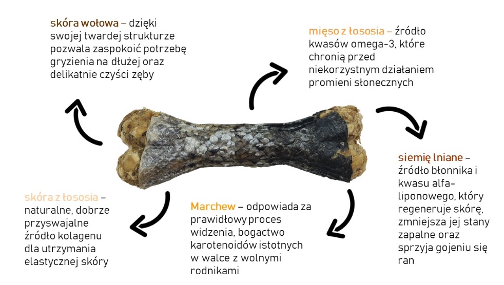 Dobór poszczególnych komponentów kości do żucia dla psa został dokładnie przemyślany, gdyż ma określone funkcje do spełnienia. Nadzienie, które wypełnia kość ma za zadanie utrzymać skórę w odpowiedniej kondycji oraz wzmocnić włos/sierść, pozostawiając ją zdrową, elastyczną i pięknie lśniącą.