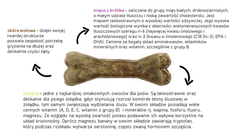 Te psie rarytasy powstały z nieprzetworzonych produktów, gdzie głównymi składnikami kości dla niejadków są: skóra wołowa, mięso z królika oraz banany.