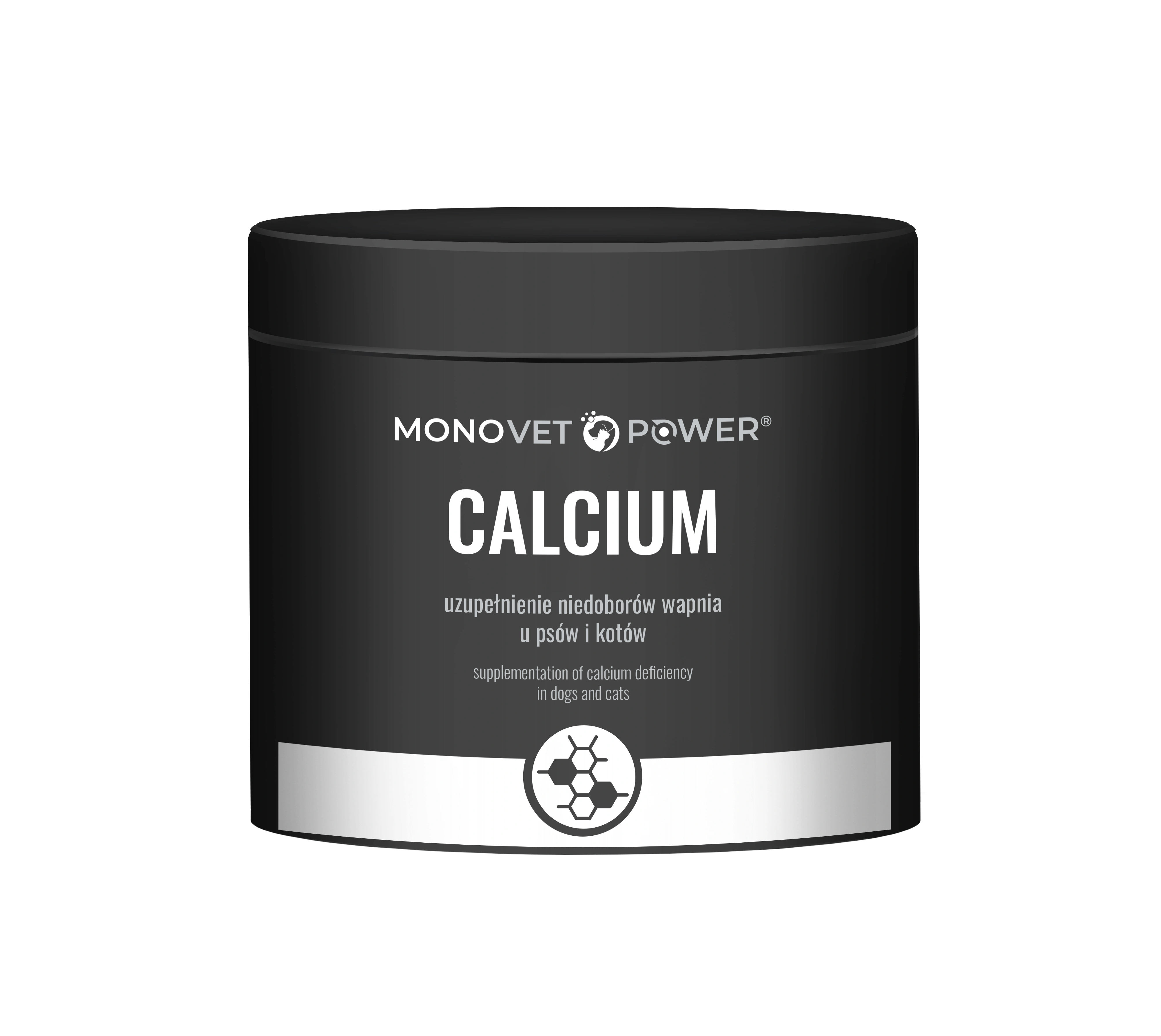 Produkt w postaci proszku wspierający zdrowie układu kostnego psów i kotów, dostarczający łatwo przyswajalne formy wapnia i fosforu, niezbędne do prawidłowego funkcjonowania układu ruchu.