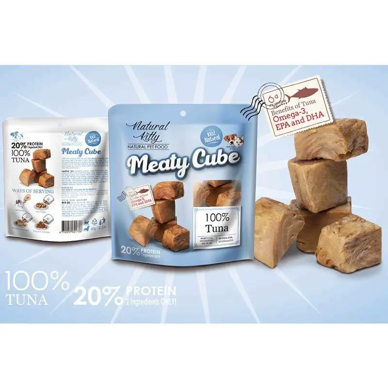 Przysmak zawiera 100% mięsa z tuńczyka. Składniki są gotowane na parze w celu wzmocnienia smaku i aromatu, przy jednoczesnym zachowaniu ważnych składników odżywczych. Meaty Cube to najlepsza codzienna nagroda dla Twojego pupila. Może być podawana jako smakołyk, lekki posiłek lub jako uzupełnienie głównego posiłku.
