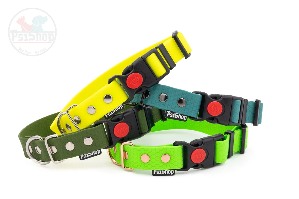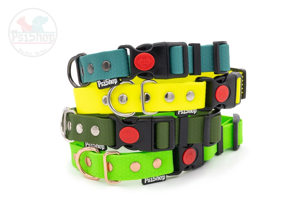 Wodoodporna obroża wykonana z materiału PVC/TPU. Po obu stronach ma wzór plastra miodu. Taśma z której wykonane są obroże PsiShop nie rozciąga się, jest odporna na warunki atmosferyczne.