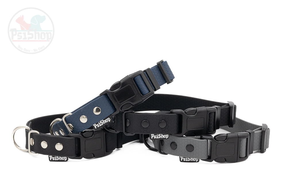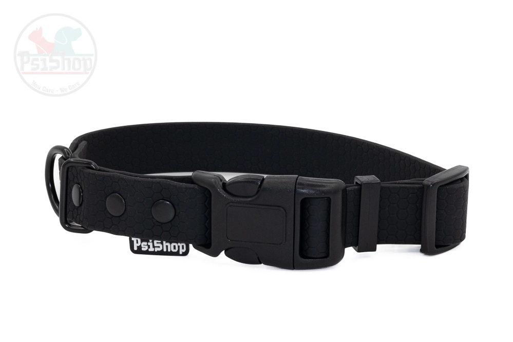 Wodoodporna obroża wykonana z materiału PVC/TPU. Po obu stronach ma wzór plastra miodu. Taśma z której wykonane są obroże PsiShop nie rozciąga się, jest odporna na warunki atmosferyczne.
