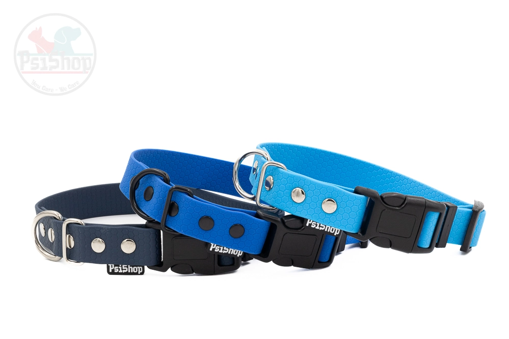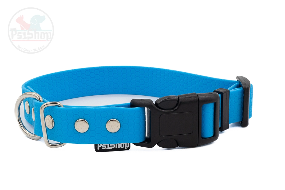 Wodoodporna obroża wykonana z materiału PVC/TPU. Po obu stronach ma wzór plastra miodu. Taśma z której wykonane są obroże PsiShop nie rozciąga się, jest odporna na warunki atmosferyczne.