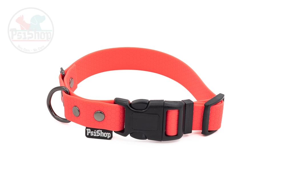Wodoodporna obroża wykonana z materiału PVC/TPU. Po obu stronach ma wzór plastra miodu. Taśma z której wykonane są obroże PsiShop nie rozciąga się, jest odporna na warunki atmosferyczne.