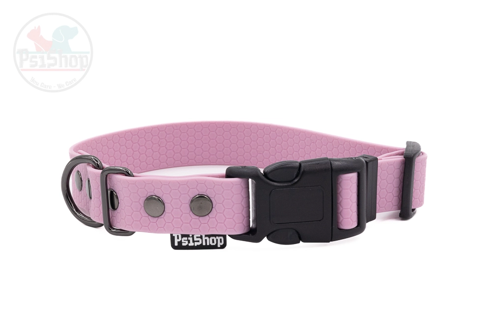Wodoodporna obroża wykonana z materiału PVC/TPU. Po obu stronach ma wzór plastra miodu. Taśma z której wykonane są obroże PsiShop nie rozciąga się, jest odporna na warunki atmosferyczne.