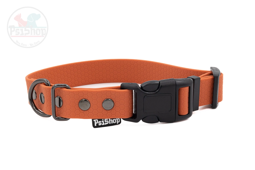 Wodoodporna obroża wykonana z materiału PVC/TPU. Po obu stronach ma wzór plastra miodu. Taśma z której wykonane są obroże PsiShop nie rozciąga się, jest odporna na warunki atmosferyczne.