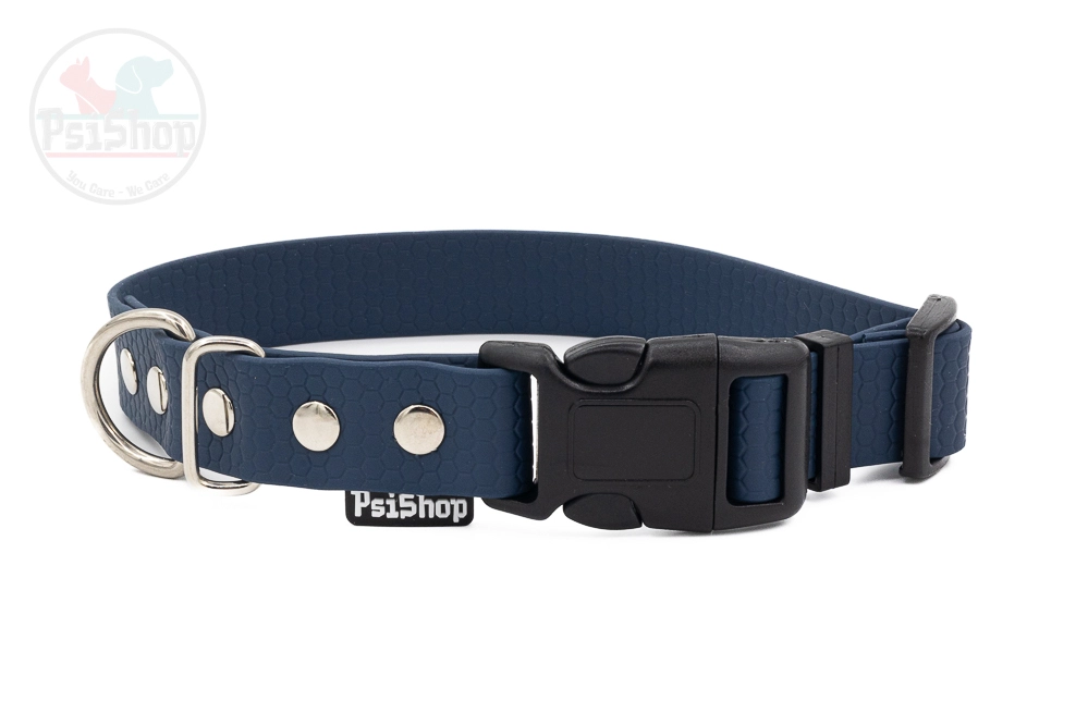 Wodoodporna obroża wykonana z materiału PVC/TPU. Po obu stronach ma wzór plastra miodu. Taśma z której wykonane są obroże PsiShop nie rozciąga się, jest odporna na warunki atmosferyczne.