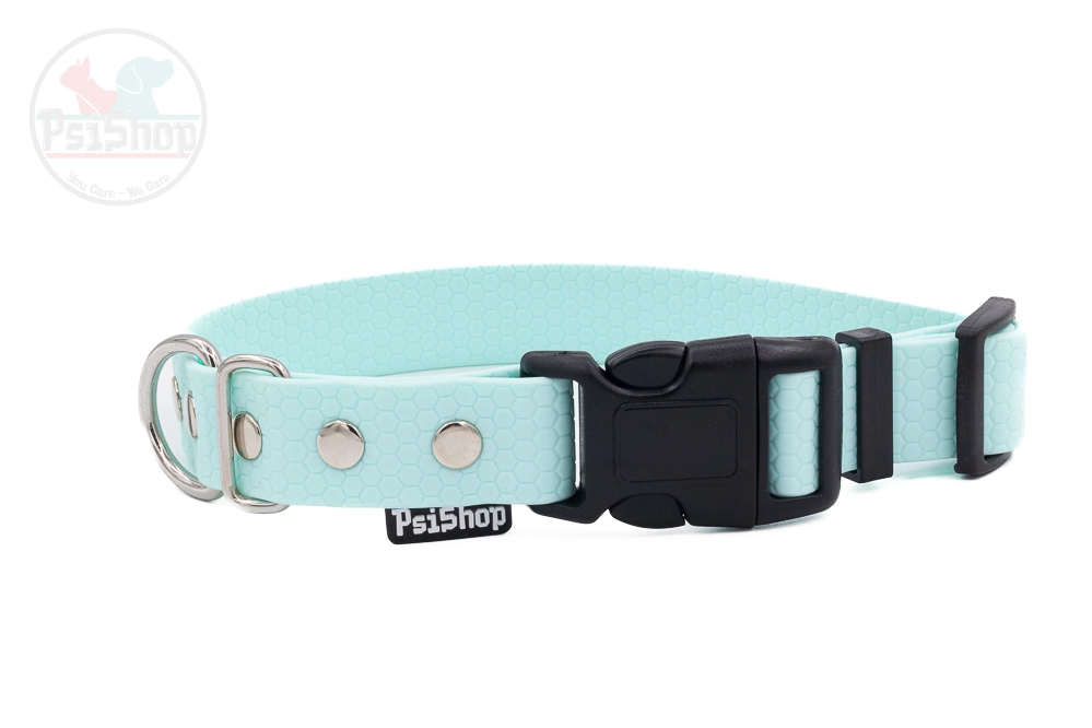 Wodoodporna obroża wykonana z materiału PVC/TPU. Po obu stronach ma wzór plastra miodu. Taśma z której wykonane są obroże PsiShop nie rozciąga się, jest odporna na warunki atmosferyczne.