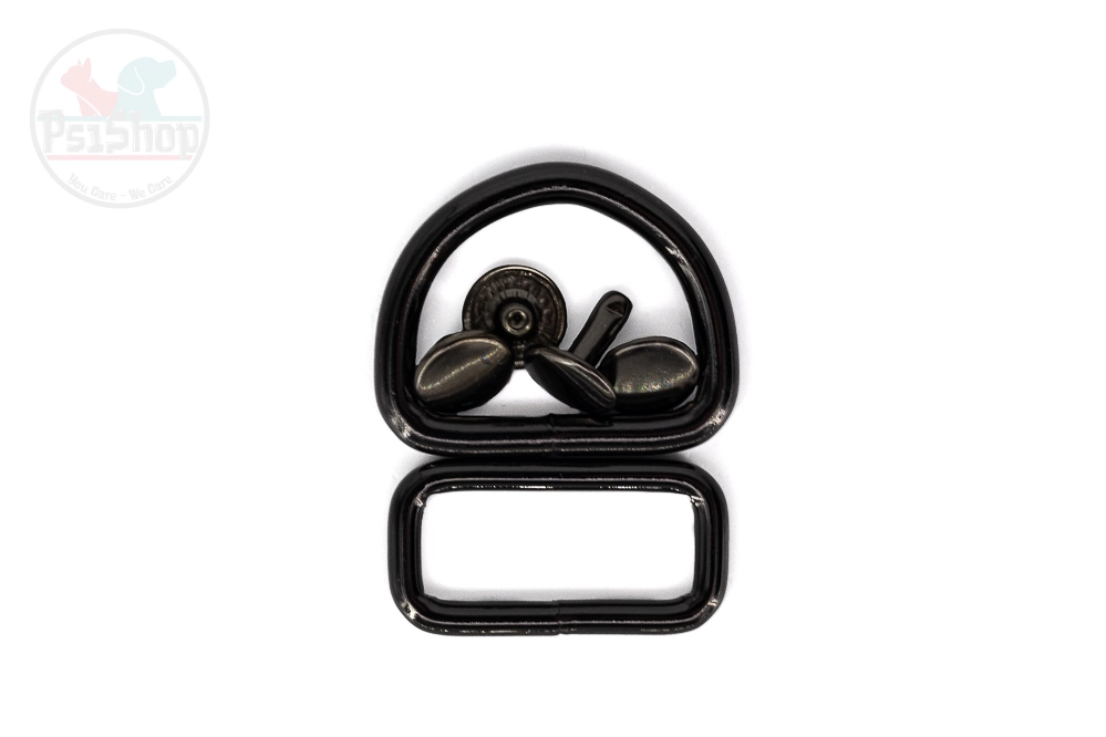 Możesz wybrać spośród 5 kolorów okuć. Czarnego matu, srebrnego połysku, grafitowego połysku, koloru mosiądzu w macie i różowego w połysku. Do każdej obroży zakładamy wytrzymałą ramkę na adresówkę !