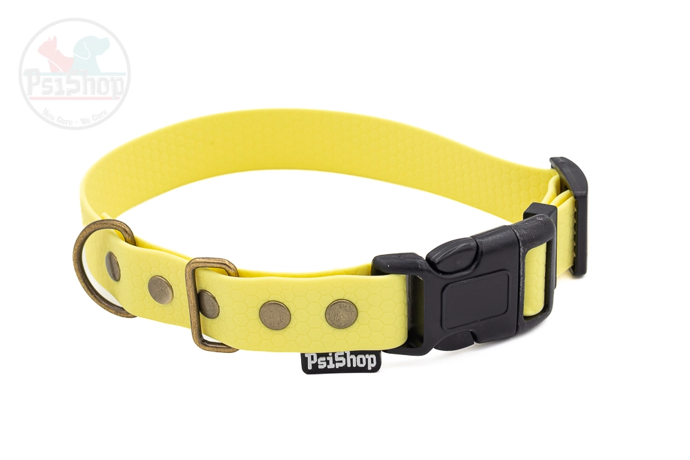 Wodoodporna obroża wykonana z materiału PVC/TPU. Po obu stronach ma wzór plastra miodu. Taśma z której wykonane są obroże PsiShop nie rozciąga się, jest odporna na warunki atmosferyczne.