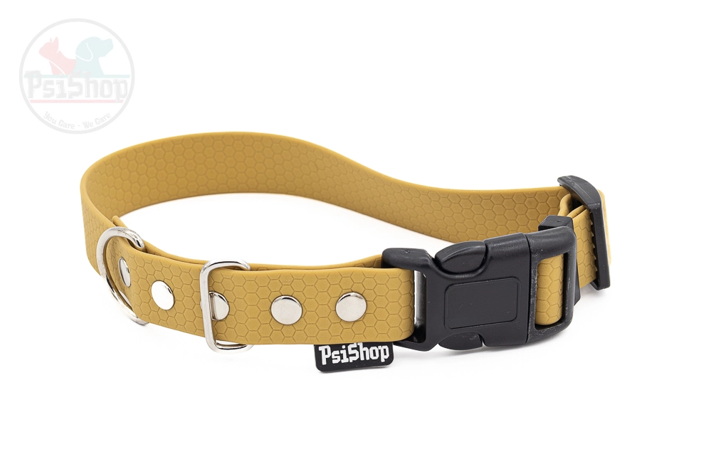 Wodoodporna obroża wykonana z materiału PVC/TPU. Po obu stronach ma wzór plastra miodu. Taśma z której wykonane są obroże PsiShop nie rozciąga się, jest odporna na warunki atmosferyczne.