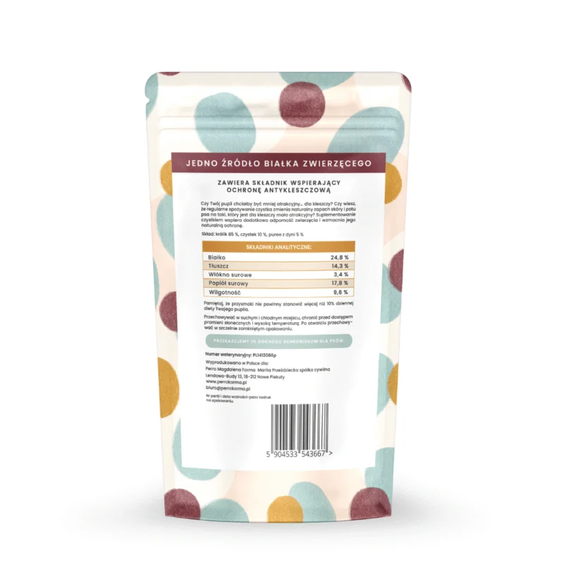 Skład: królik 85 %, czystek 10%, puree z dyni 5%