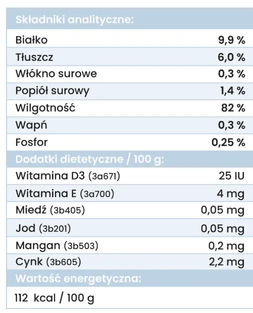 Skład: jeleń (88,4 %, w tym: 73,8 % mięso mięśniowe, 14,6 % podroby: płuca, żołądek, tchawica, serca), gruszka (4 %), dynia (3,4 %), olej z łososia (2 %), witaminy i minerały (1 %), inulina (0,65 %), algi morskie brunatne (0,29 %), małż nowozelandzka (0,14 %), zioła (0,12 %, w tym: dzika róża, pokrzywa, jeżówka, kurkuma, ostropest plamisty).