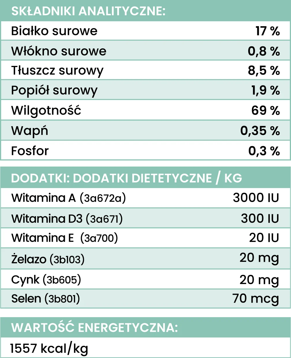 Skład: konina (88,8 %, w tym: 74,2 % mięso mięśniowe, 14,6 % podroby: serca, ozory), dynia (8 %), olej z łososia (1 %), witaminy i minerały (1 %), inulina (0,65 %), algi morskie brunatne (0,29 %), małż nowozelandzka (0,14 %), zioła (0,12 %, w tym: dzika róża, pokrzywa, jeżówka, kurkuma, ostropest plamisty).