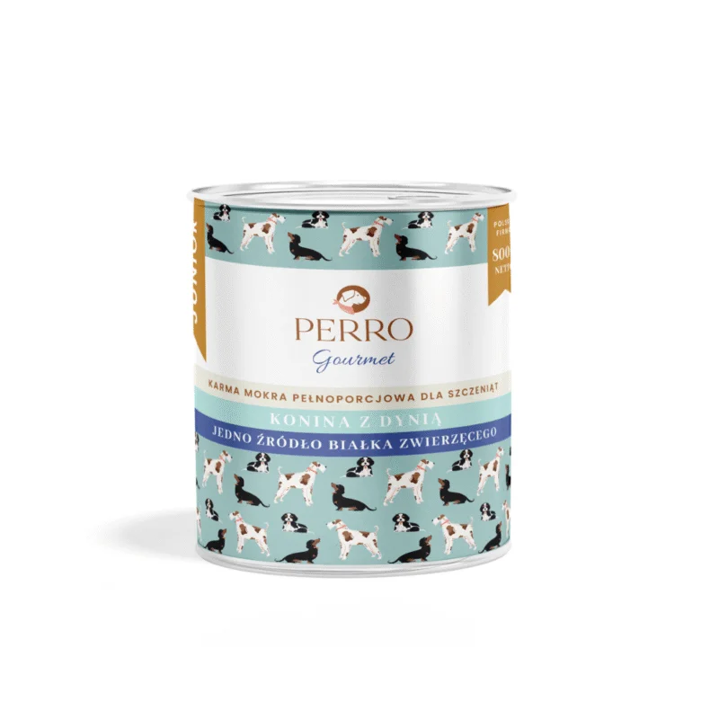 PERRO Gourmet JUNIOR Konina z Dynią to połączenie najwyższej jakości składników i pełnowartościowego smaku – idealny wybór dla młodych, wymagających psów.