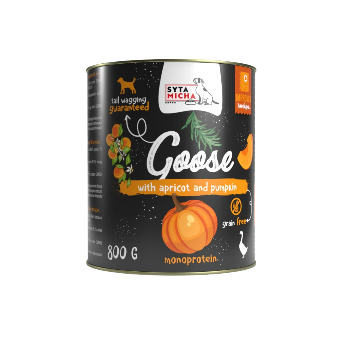 Syta Micha Gęś z morelami i dynią to wyjątkowa, pełnoporcjowa mokra karma dla dorosłych psów wszystkich ras, stworzona z myślą o zdrowiu i dobrym samopoczuciu pupila. Formuła oparta na delikatnej gęsinie dostarcza wysokiej jakości, łatwo przyswajalne białko, a dodatek moreli i dyni wzbogaca dietę w naturalne witaminy, przeciwutleniacze i składniki wspierające odporność. Olej z łososia dostarcza niezbędnych kwasów omega-3, które korzystnie wpływają na kondycję skóry, sierści oraz stawów.