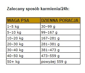 Podane w tabeli dzienne zapotrzebowanie jest orientacyjne. Zapotrzebowanie pokarmowe może się różnić ze względu na rasę, wiek, temperament i poziom aktywności zwierzęcia. Dzienną porcję karmy zaleca się podzielić na dwa posiłki. Zmianę rodzaju karmy należy wprowadzać stopniowi. Zapewnij psu stały dostęp do świeżej, czystej wody.