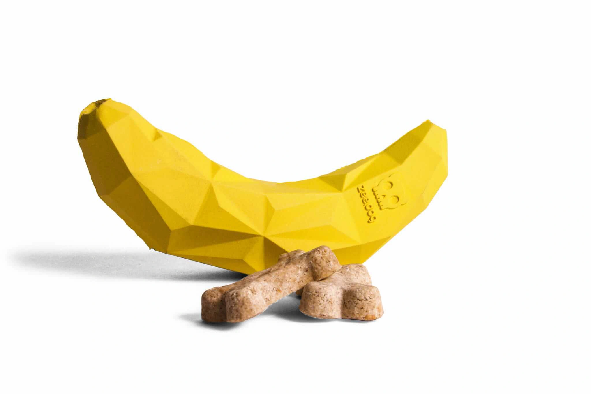 Nietypowy kształt z przesłaniem – inspirowany bananem, by przypominać opiekunowi o znaczeniu zbilansowanej diety dla zdrowia i dobrej kondycji pupila.
